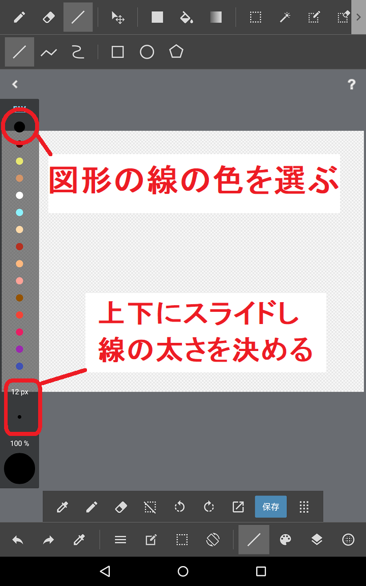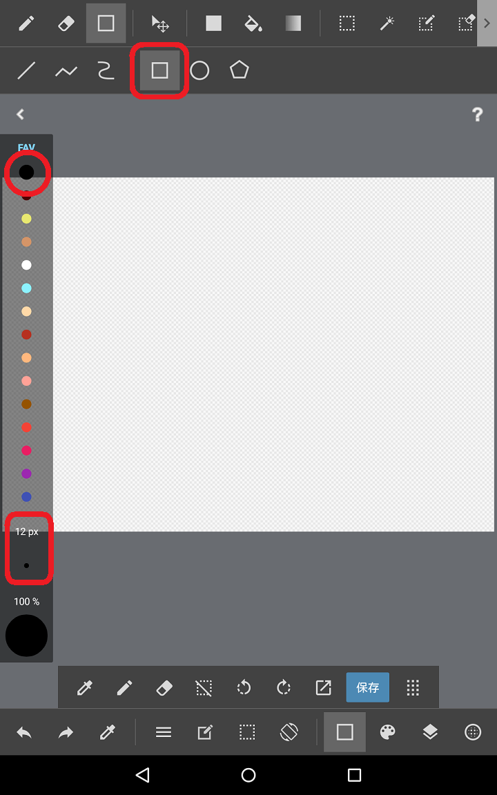 2、『図形メニュー』から<四角アイコン>をタップし、『色選択バー』で<線の色と太さ>を決めます。